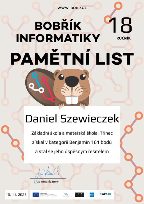 V uplynulých dnech se žáci naší školy zapojili do celostátní informatické soutěže Bobřík informatiky, která prověřuje logické myšlení, strategii, práci s informacemi i informatické dovednosti.