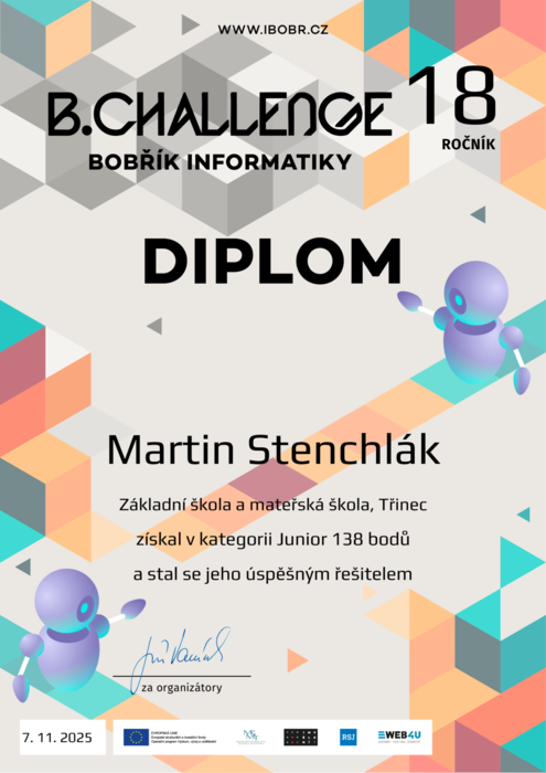 Děkujeme všem žákům za skvělou reprezentaci školy. Jejich úspěchy nás těší a inspirují k dalšímu rozvoji výuky informatiky a digitální gramotnosti.