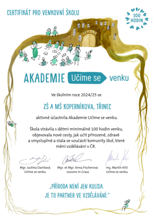 V letošním školním roce jsme se stali součástí Akademie Učíme se venku. S dětmi jsme strávili venku opravdu mnoho hodin a můžeme tak říci, že se u nás ve škole venku nejen hraje, běhá, chodí, ale také učí!