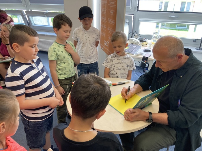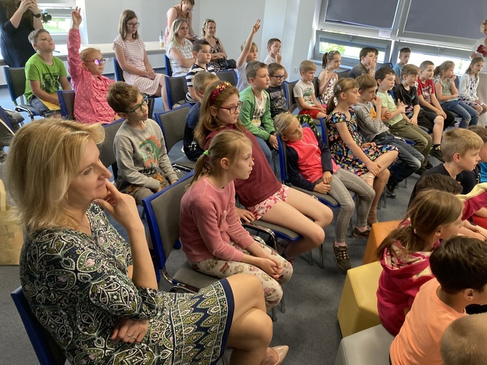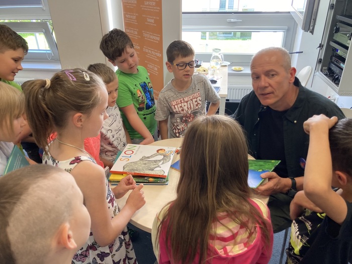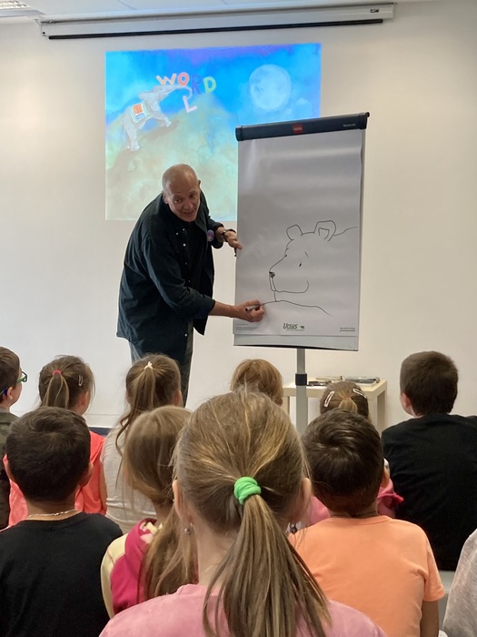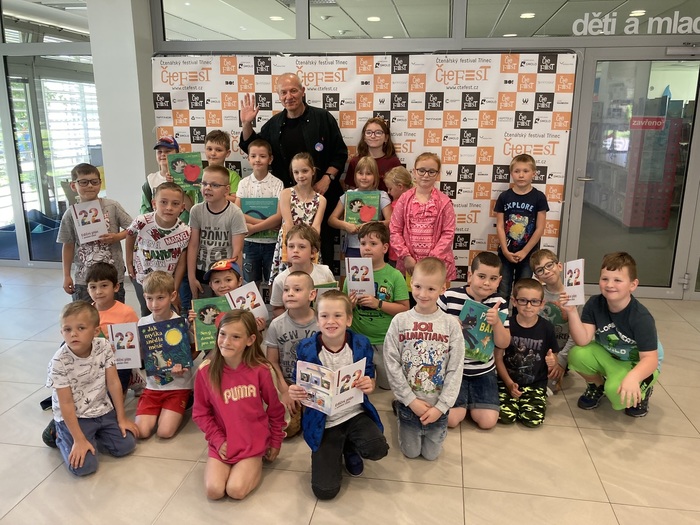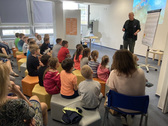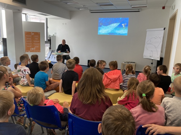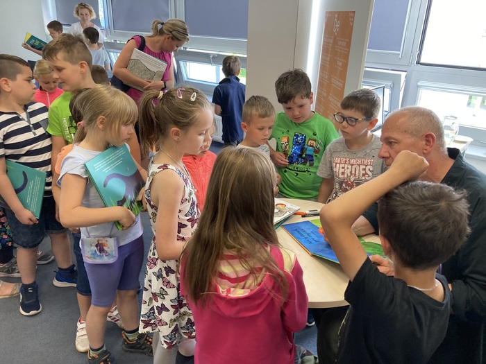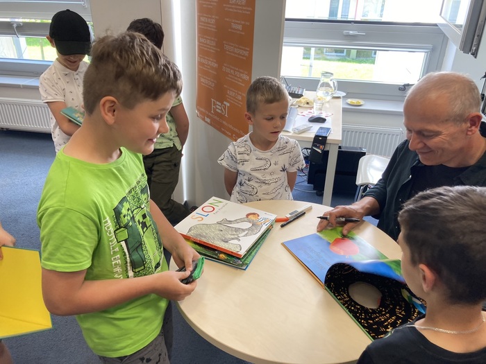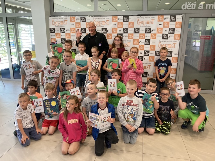 Na setkání se spisovatelem a výtvarníkem Petrem Horáčkem jsme se nemohli dočkat. S oblibou pracujeme s jeho knihami od první třídy a vždy nám připomene důležité životní moudro. Jeho příběhy jsou laskavé, hodnotné, vtipné a doplněné překrásnými ilustracemi. Vidět ho kreslit, předčítat a povídat si s ním byl pro nás nezapomenutelný zážitek. Na živo jsme se s ním setkali poprvé a cítili jsme, že jeho knihy vypovídají přesně o tom, jaký je on sám - přirozený, příjemný a usměvavý. Navíc jsme od něho dostali autogram a obrázek hlavních postav z jeho knih. My jsme ale pro něho taky měli překvapení. Předali jsme mu koláž tvořenou vzkazy, záznamy z četby jeho knížek, napodobeniny jeho kreseb a pozdravy. Věříme, že se ještě uvidíme.
